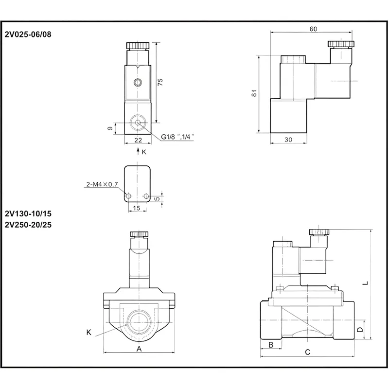 Las válvulas solenoides de la serie 2V incluyen la válvula solenoide de acción directa 2V025 y las válvulas solenoides operadas por piloto 2V130 / 2V250.